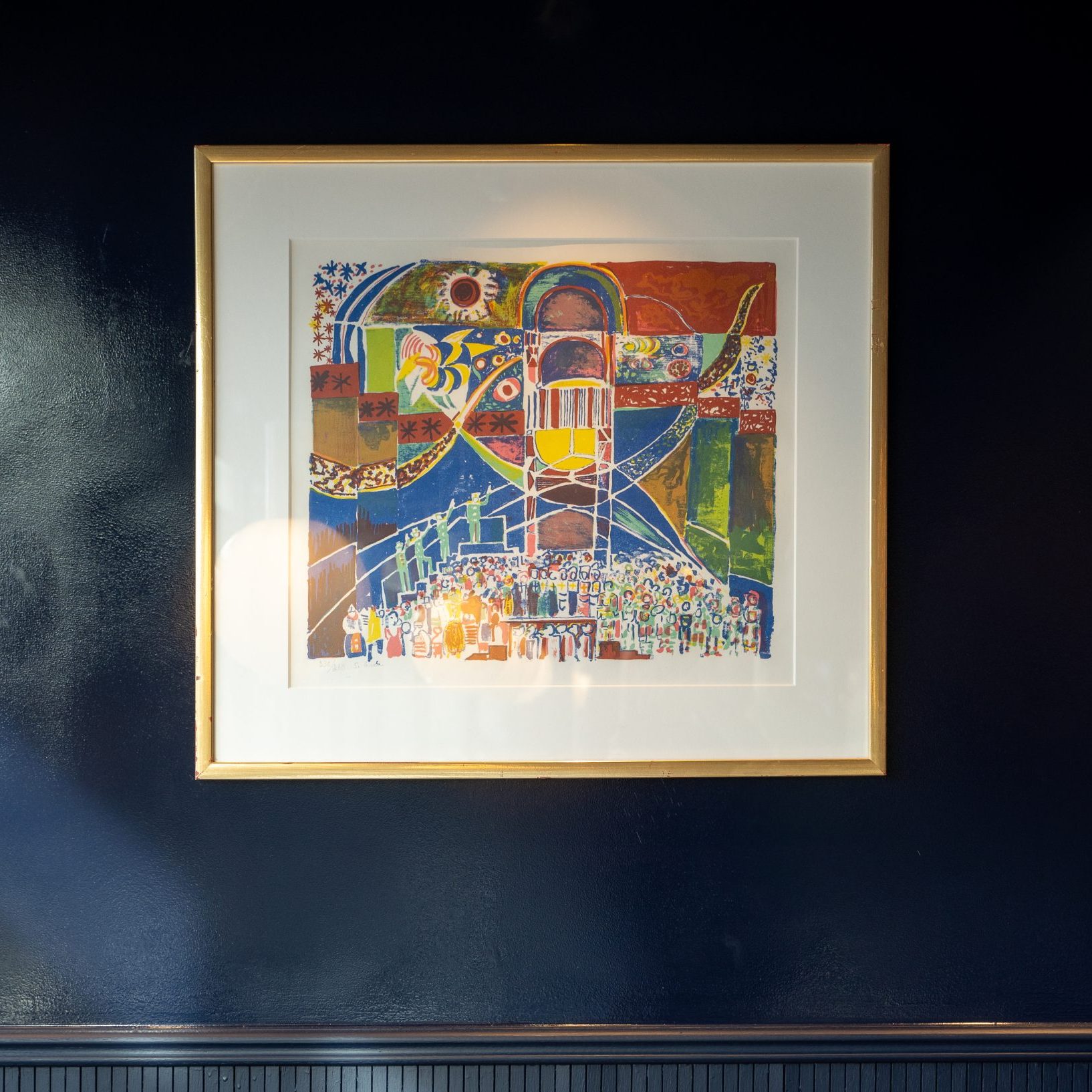 Tavlan “Ljusårssalen” (ur Aniara) av Sven X:et Erixson, som hänger på Gondolen, är ett livfullt och färgstarkt verk. Erixson var en pionjär inom modernt svenskt måleri och i tavlan ser vi en samling människor i en kosmisk miljö, vilket ger en känsla av både närhet och oändlighet. Motivet återkommer också i mattan som löper genom Gondolens matsal, vilket skapar en harmonisk helhet.